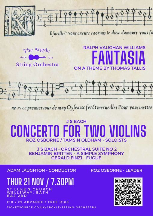 The concert will be conducted by Adam Laughton and the orchestra led by Roz Osborne. Roz and Tamsin Oldham are our soloists in Bach’s Concerto for Two Violins.